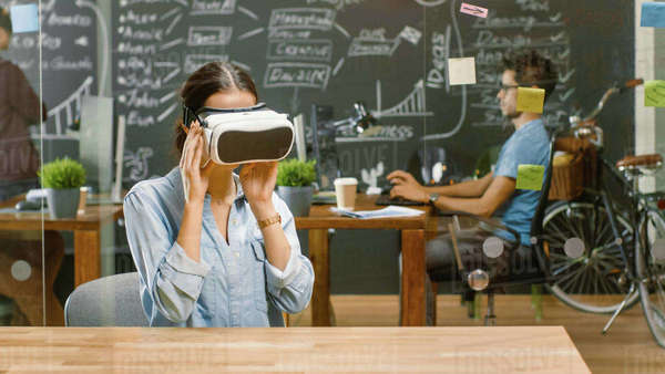 Young Female Creative Developer Wearing Virtual Reality Headset Works ...