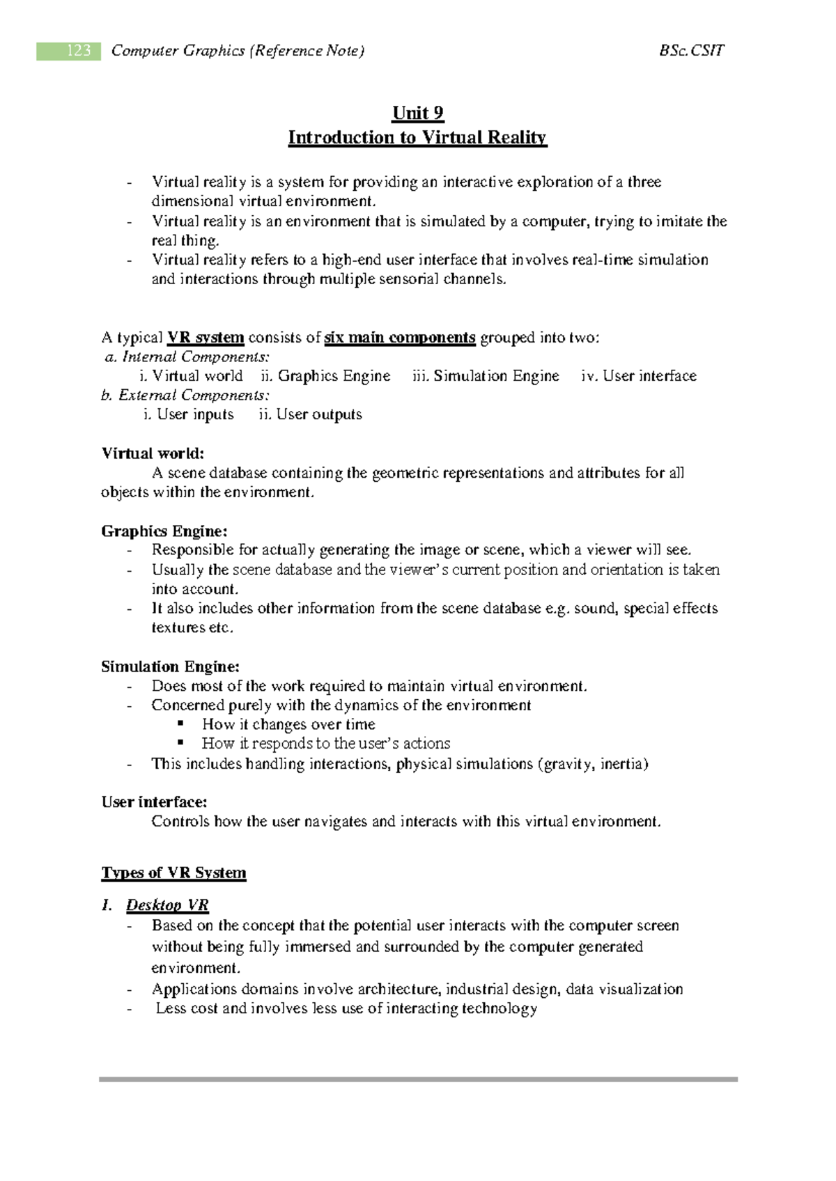 123 Computer Graphics (Reference Note) BSc.CSIT Unit 9: Virtual Reality ...