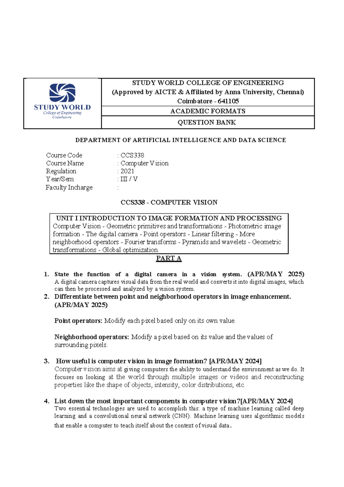 CCS338 Computer Vision Question Bank and Study Guide - Studocu