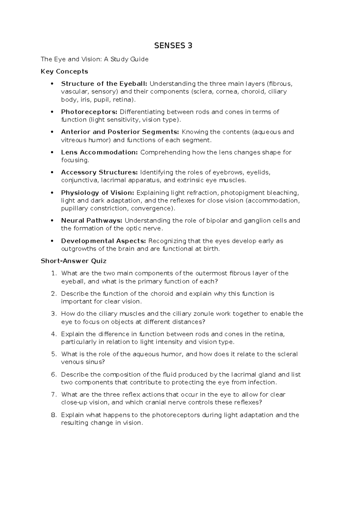 SENSES 3: The Eye and Vision Study Guide - Key Concepts and Quiz - Studocu