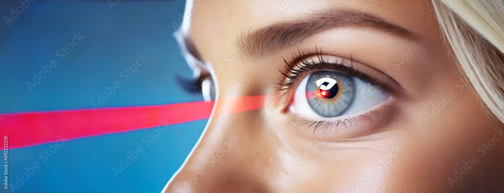 An extreme close-up of a human eye with a futuristic laser measuring ...
