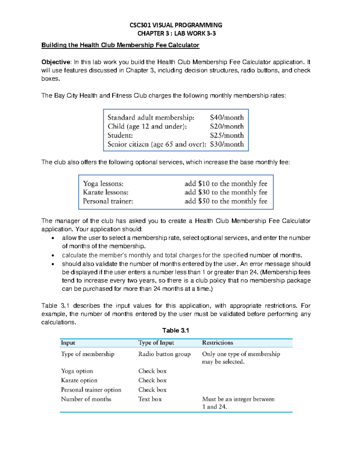 CSC301 Visual Programming Lab: Health Club Fee Calculator - Studocu