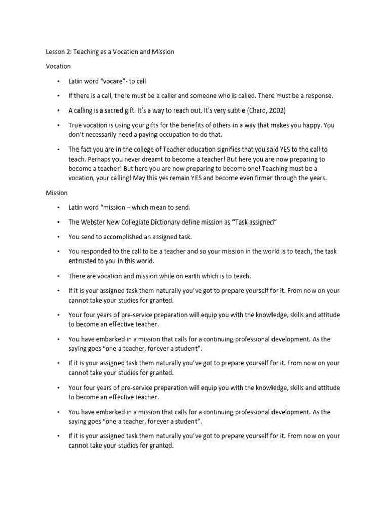 SOLUTION: Lesson 1 teaching as mission vocation profession - Studypool