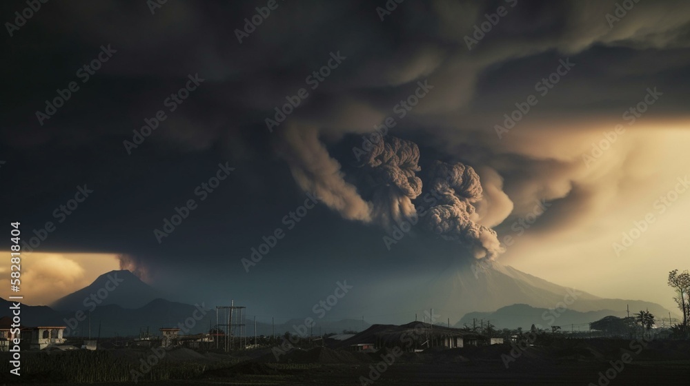 A photograph capturing the aftermath of a volcanic eruption, with ash ...