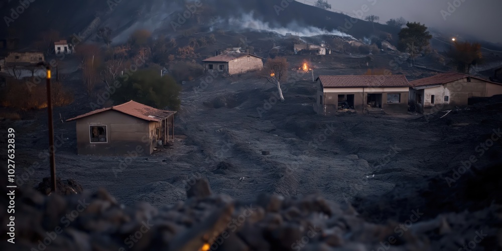 Small houses surrounded by ash after a volcanic eruption, showing the ...