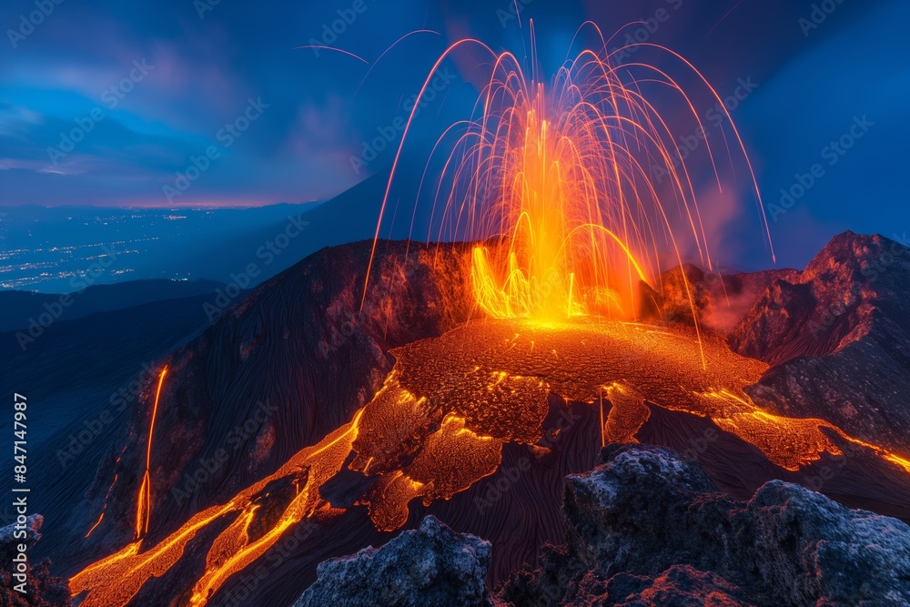 Volcano eruption at night. Natural disaster, volcano explosion. Lava ...