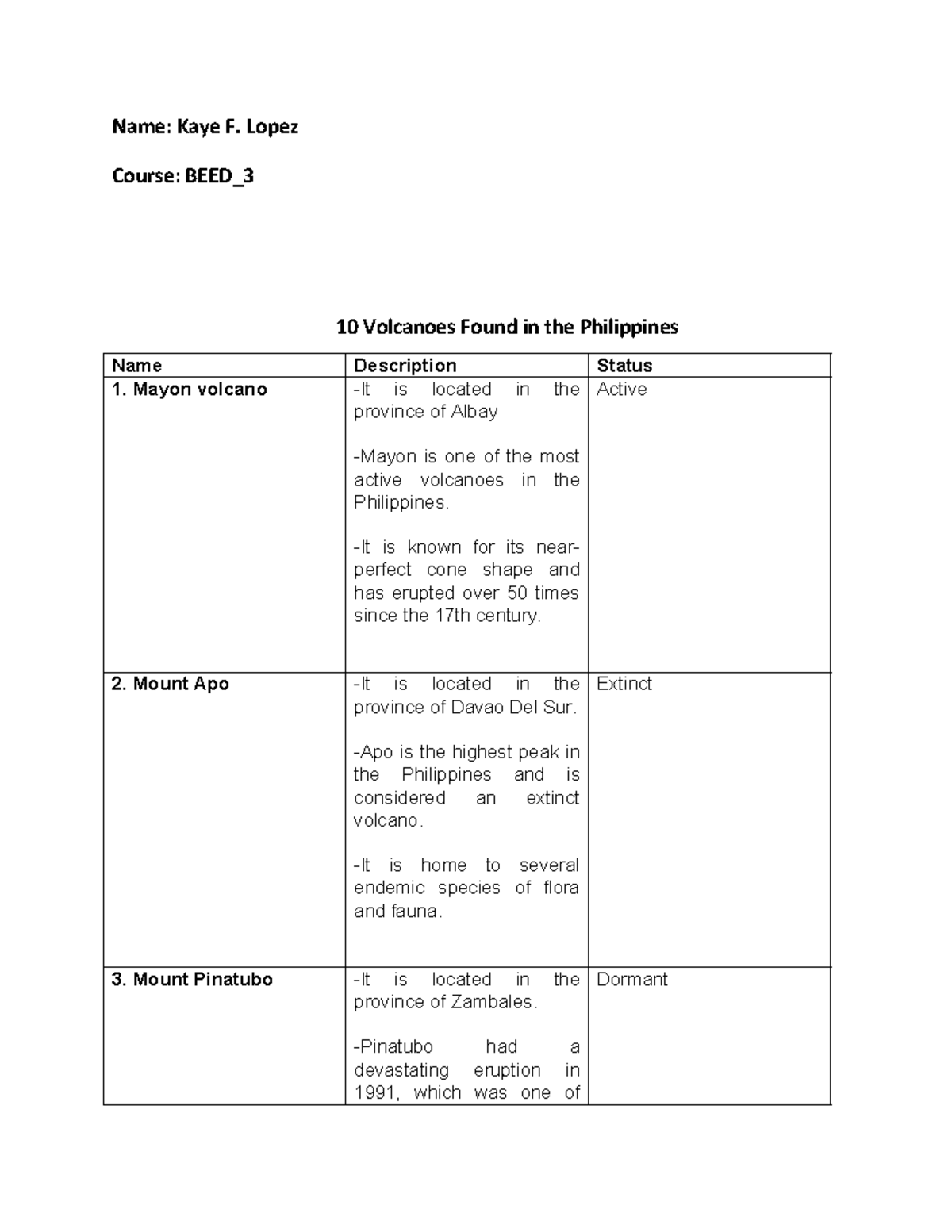 Volcano Task - school assignments - Name: Kaye F. Lopez Course: BEED ...