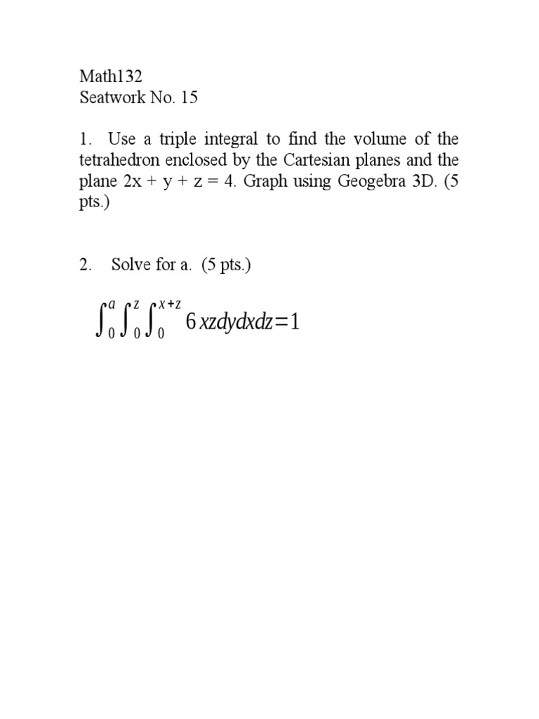 Volume of a Tetrahedron and Triple Integral Problem Solving: Seatwork ...