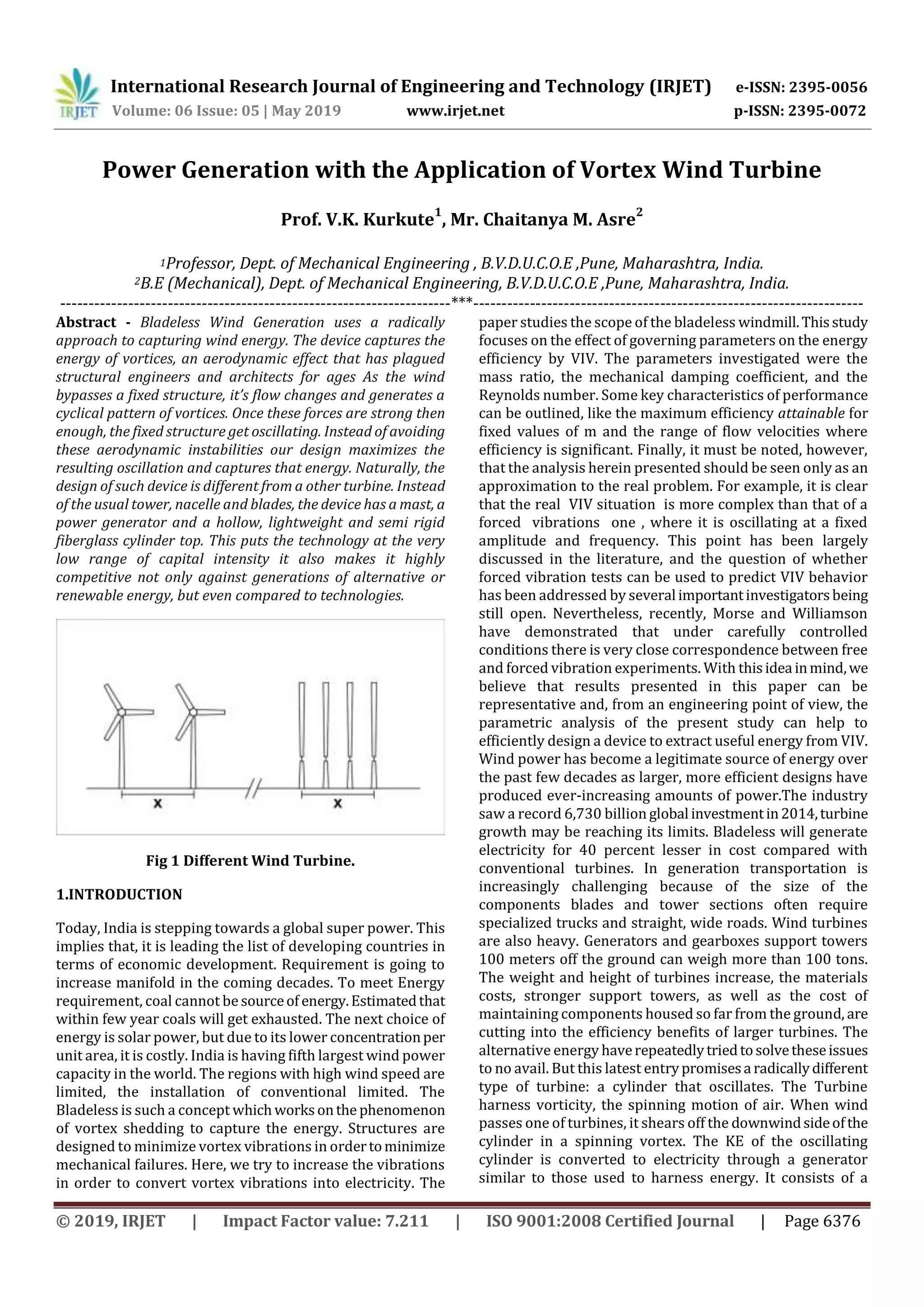 IRJET- Power Generation with the Application of Vortex Wind Turbine | PDF