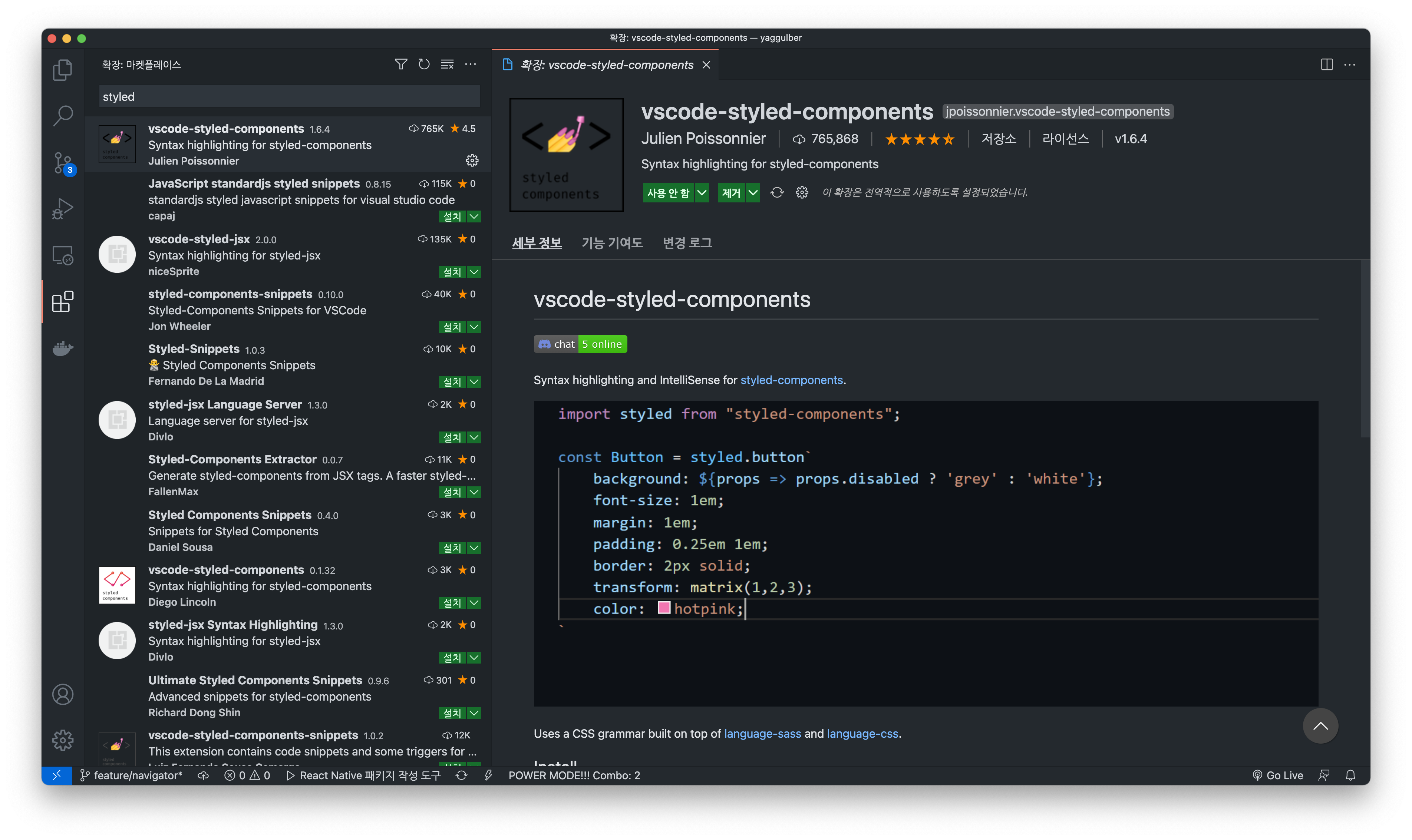 vscode-styled-components doesn't work when i use it with 'ES7+ React ...