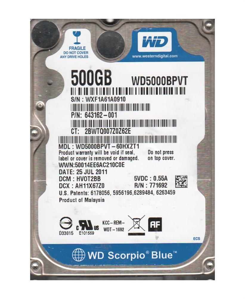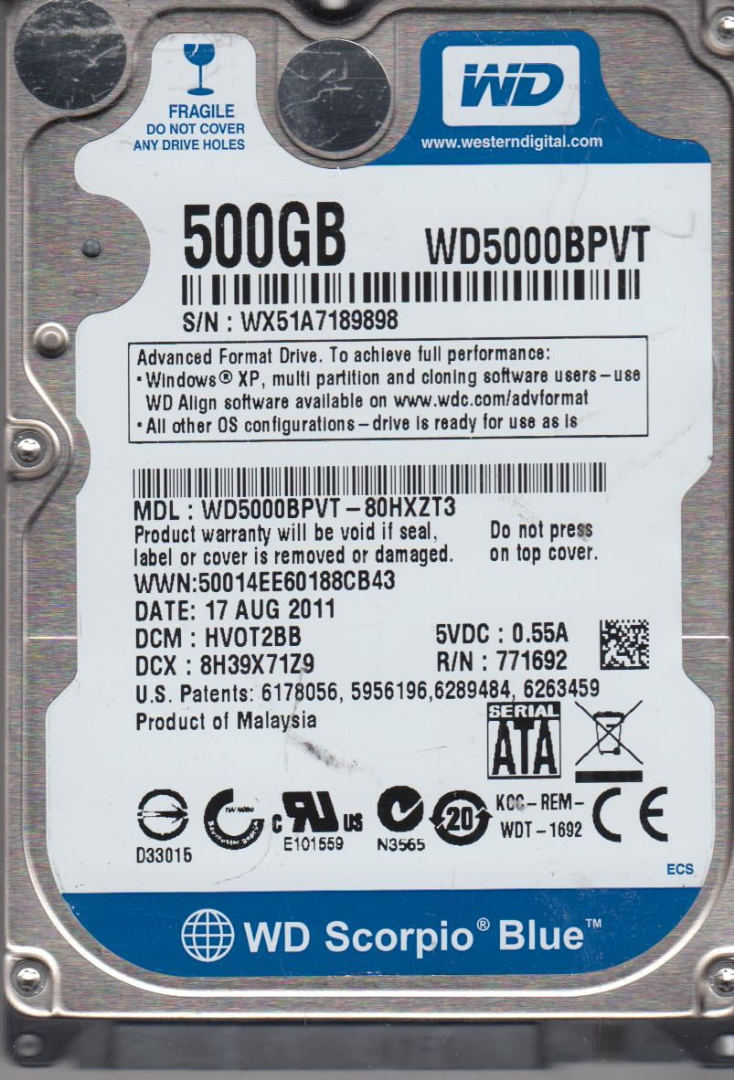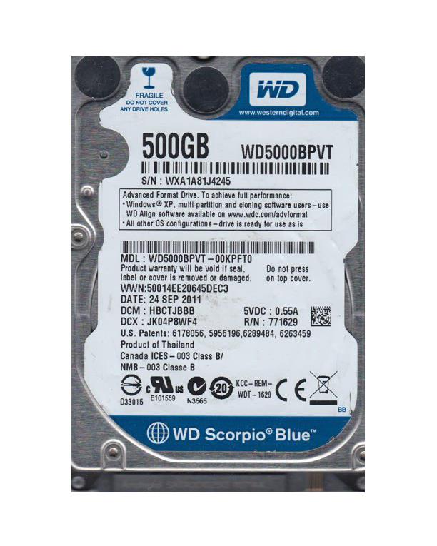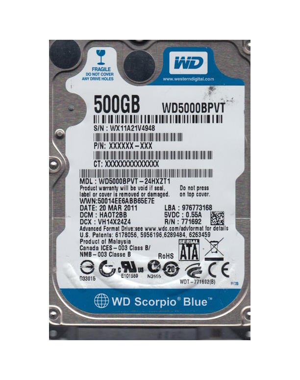 WD5000BPVT-22HXZT1, EA0TJBN, 12 MAY 2011, Western Digital 500Gb 2.5 ...