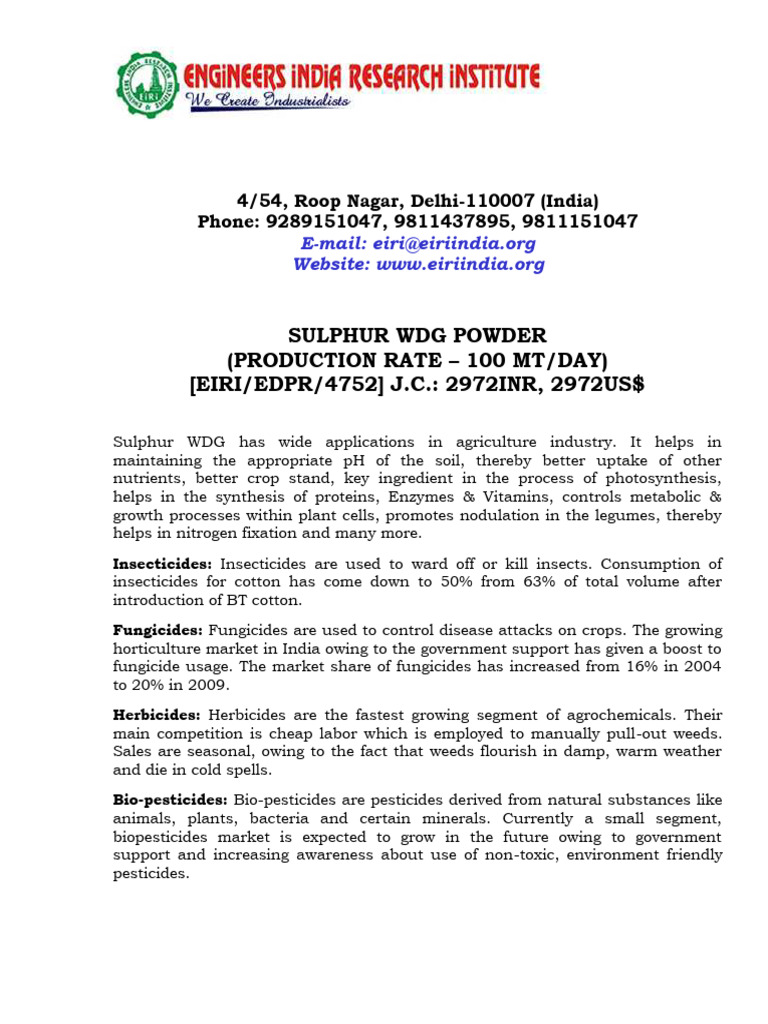 Project Report on SULPHUR WDG POWDER (PRODUCTION RATE – 100 MT/DAY ...
