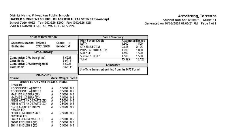 Milwaukee Public Schools Transcript - Harold S. Vincent School (Grade ...