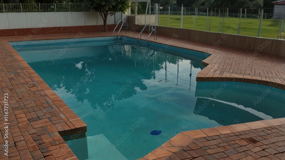 Rectangular swimming pool with brick decking, steps, and a small wading ...