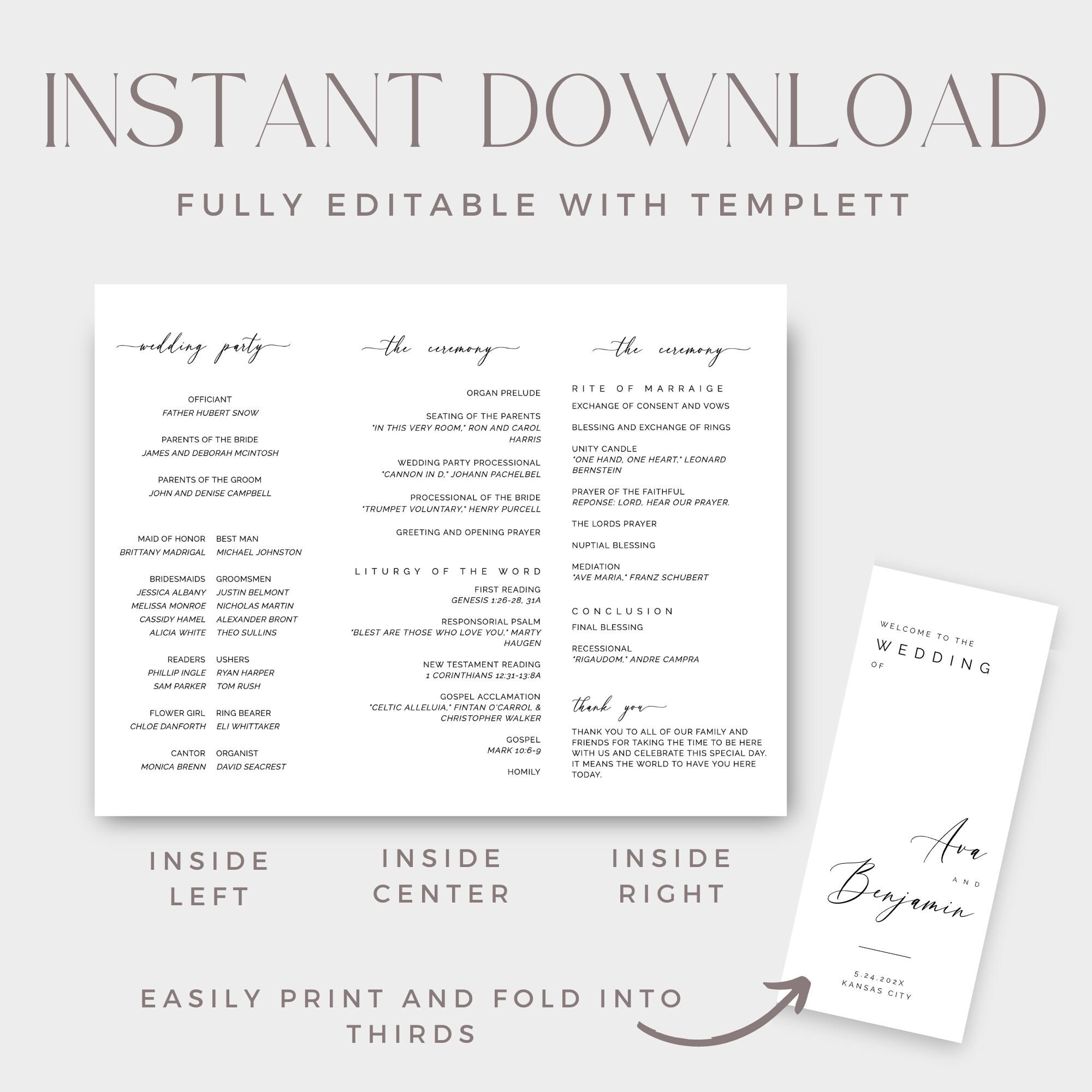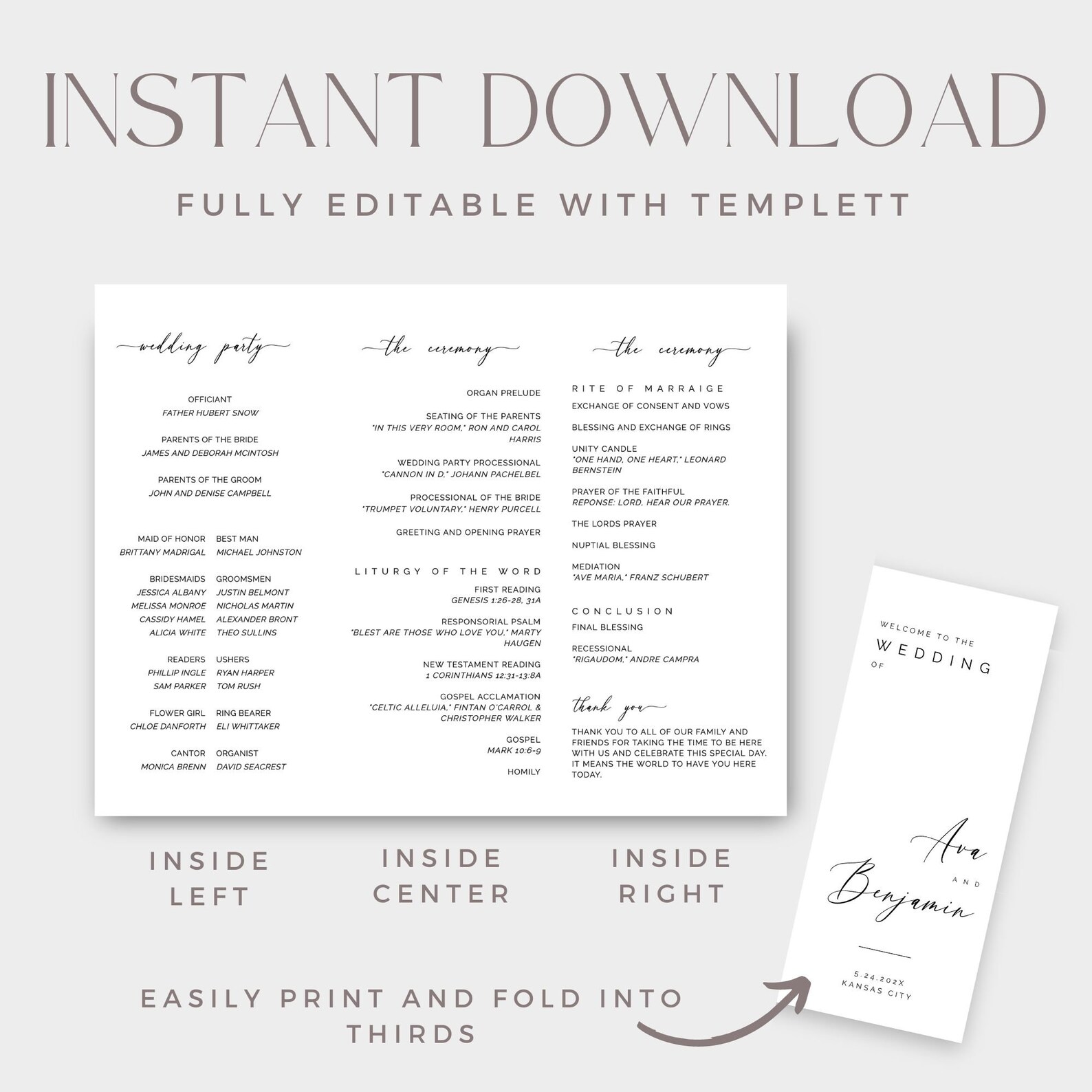 Classic Wedding Program Downloadable Trifold Template; Catholic Wedding ...