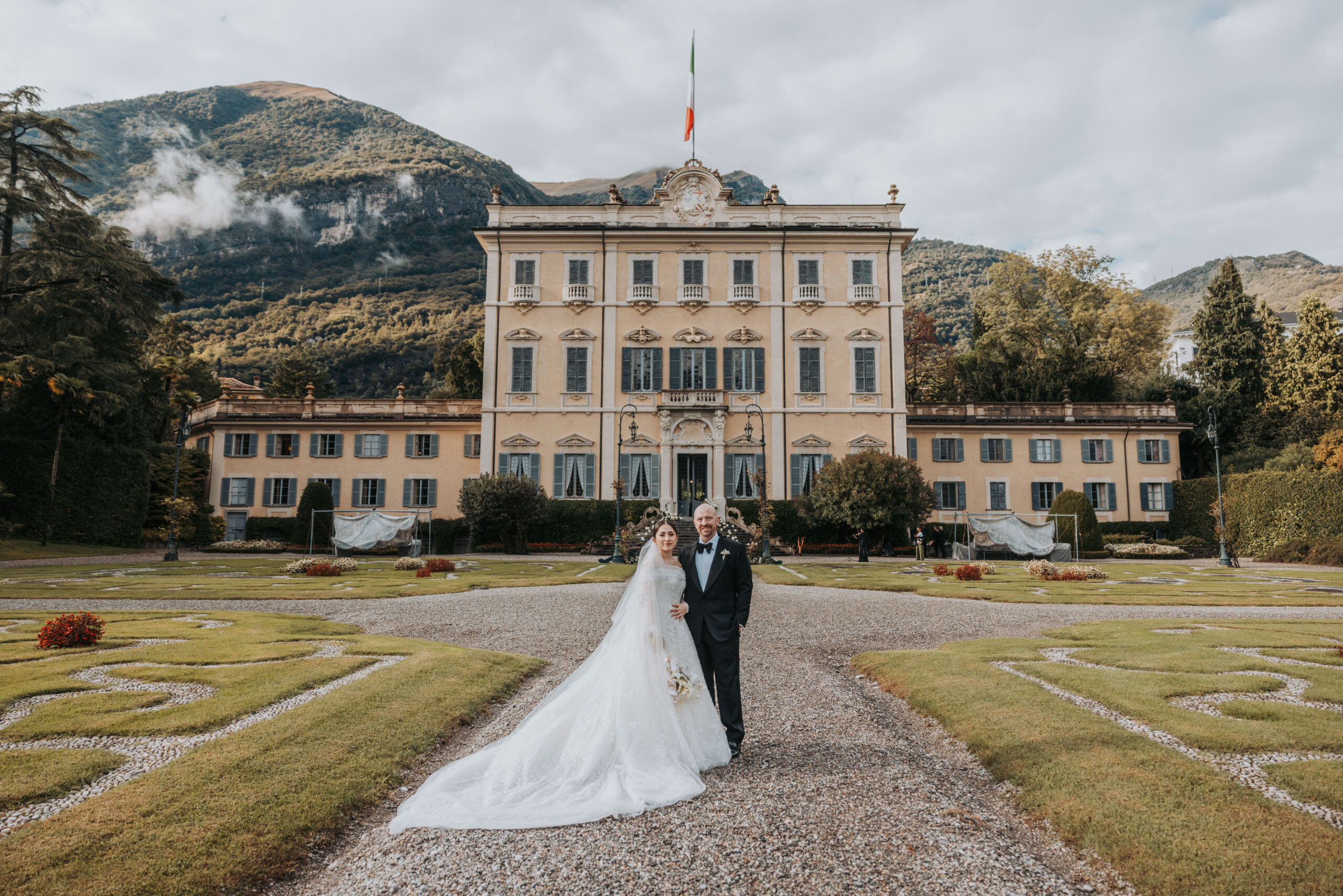 A bride and groom stand together in front of an elegant, historic villa ...