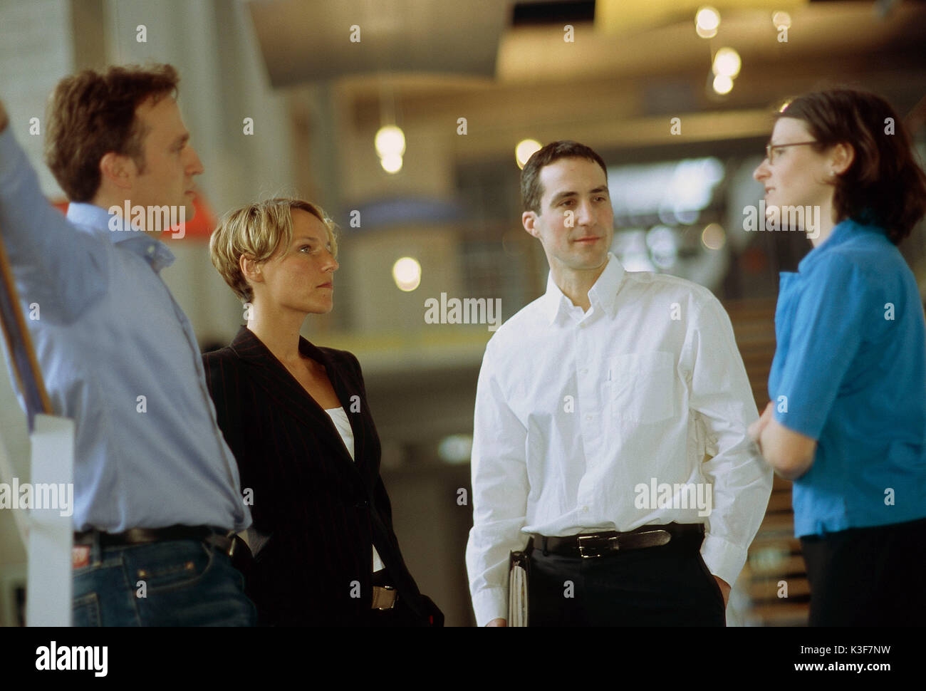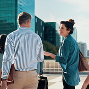 Professional workers walk along street engrossed in discussion about ...