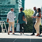 Corporate, people and walk for discussion in city for morning commute ...