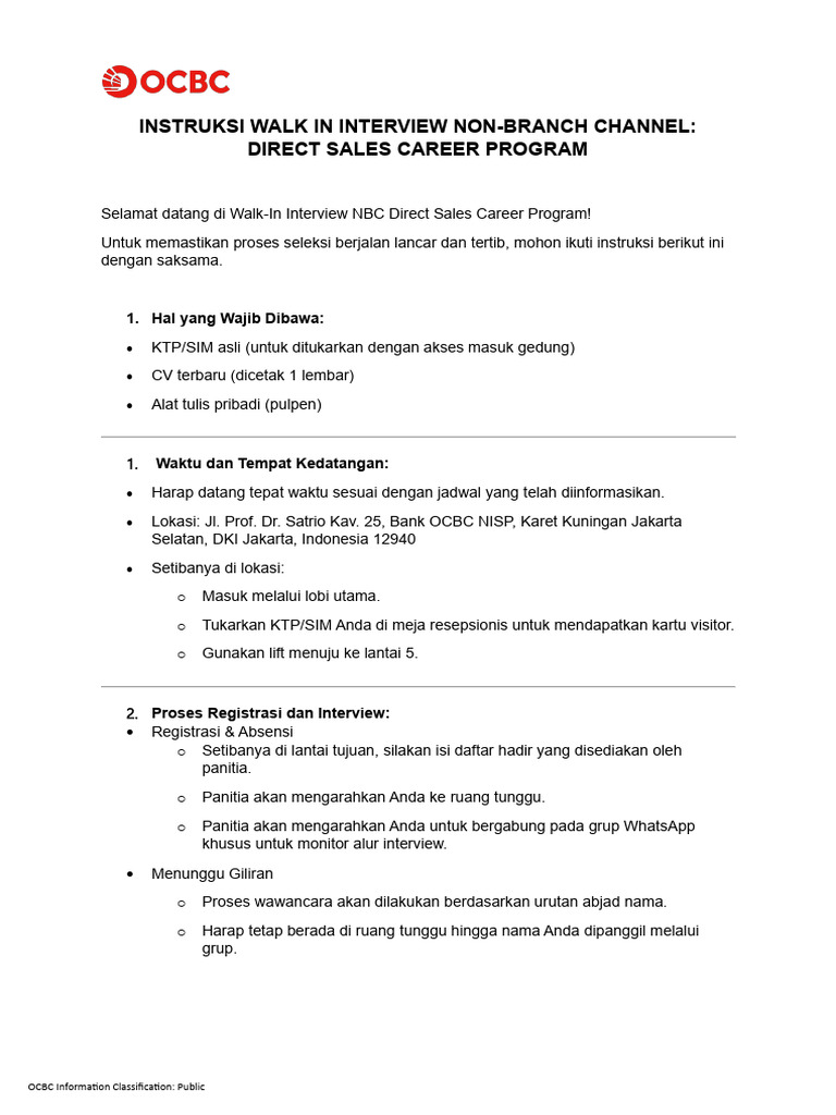 (OCBC) Instruksi Walk in Interview - NBC Direct Sales Career Program | PDF