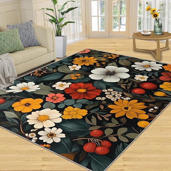 Boho Floral Area Rug, Retro Flower Bedroom Rugs, Modern Art Flower Rugs ...