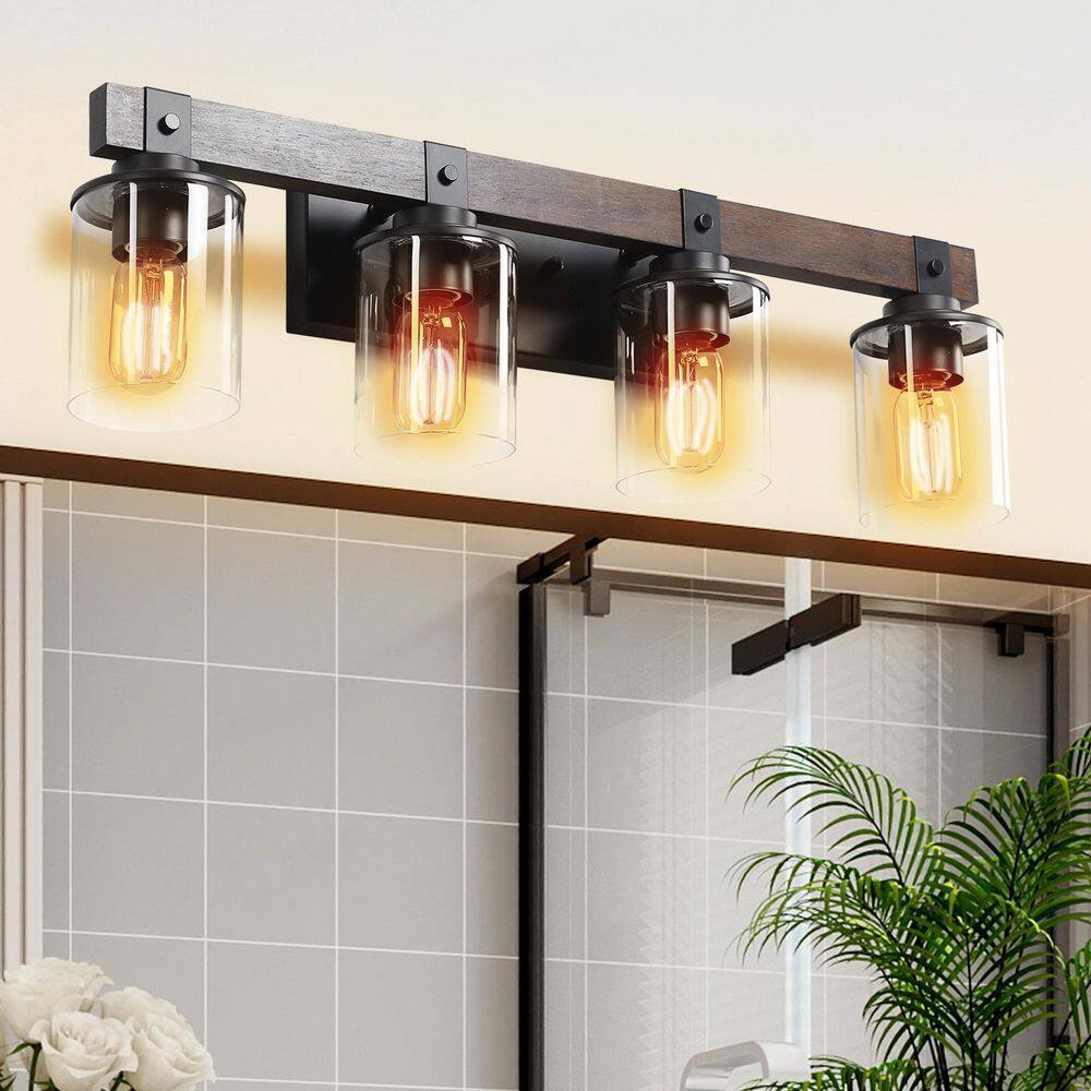 Gloweer 27 in. 4-Lights Walnut Vanity Lights,Wall Sconces with Glass ...
