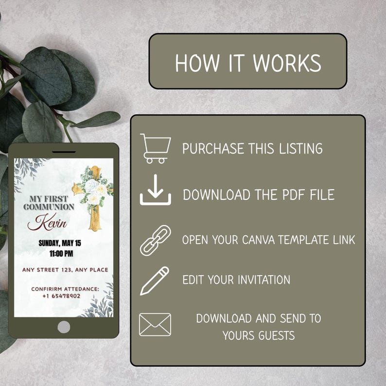 Animated Comunión Invitation Boy Editable Canva Digital Green Floral ...