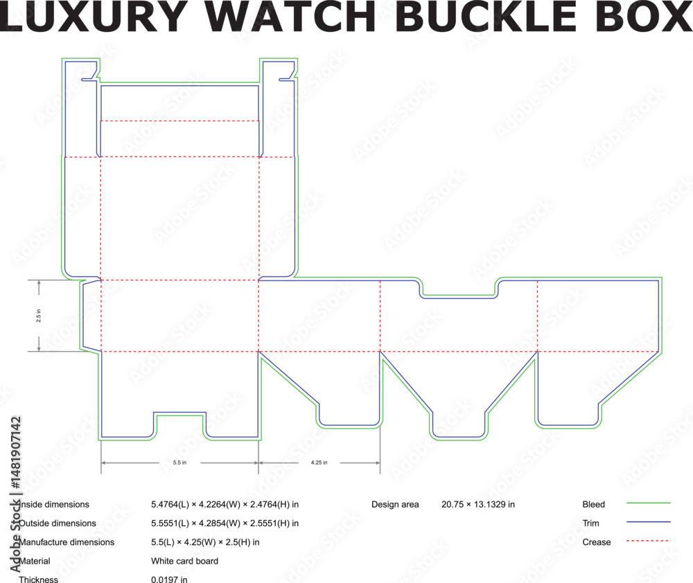 Detailed diagram of a luxury watch buckle box die cut with dimensions ...
