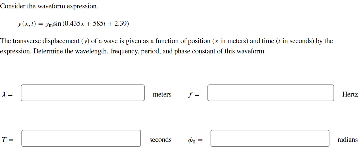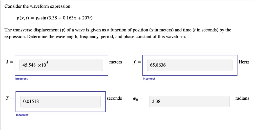 SOLVED: Consider the waveform expression: y(x,t) = Ymsin(3.38 + 0.163x ...