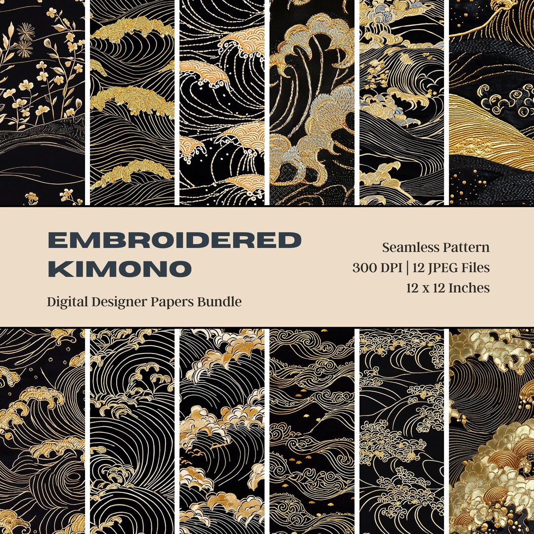12 Japanese Embroidered Wave Kimono Digital Paper, Sakura, Kimono Robe ...