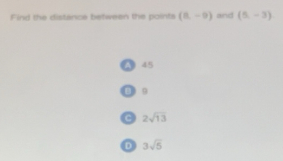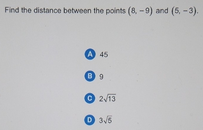 Solved: Find the distance between the points (8,-9) and (5,-3) A45 B 9 ...