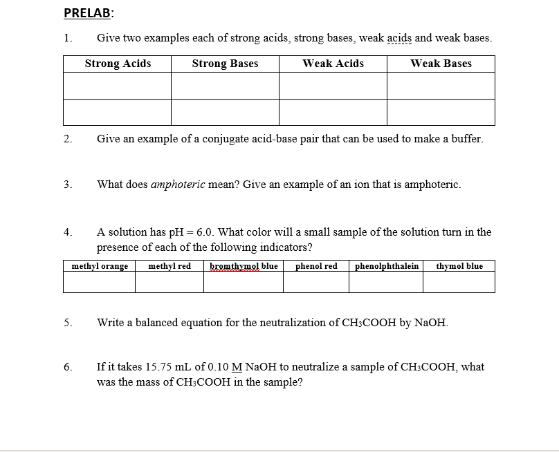 Solved PRELAB: 1. Give two examples each of strong acids, | Chegg.com