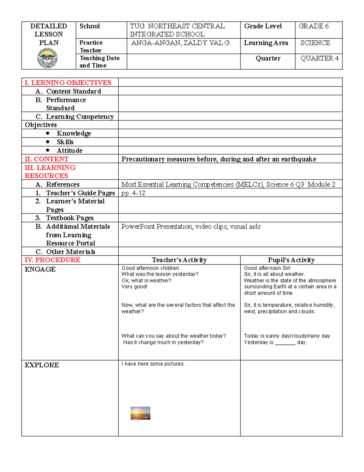 Weather - DETAILED LESSON PLAN School TUG. NORTHEAST CENTRAL INTEGRATED ...