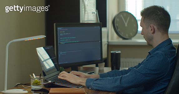 Man coding html and programming on screen Monitors, development web ...