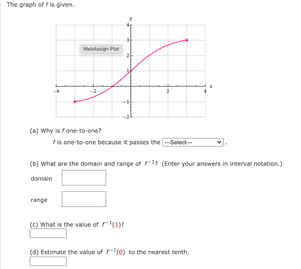 The graph of f is given: WebAssign Plot (a) Why is f one-to-one? f is ...