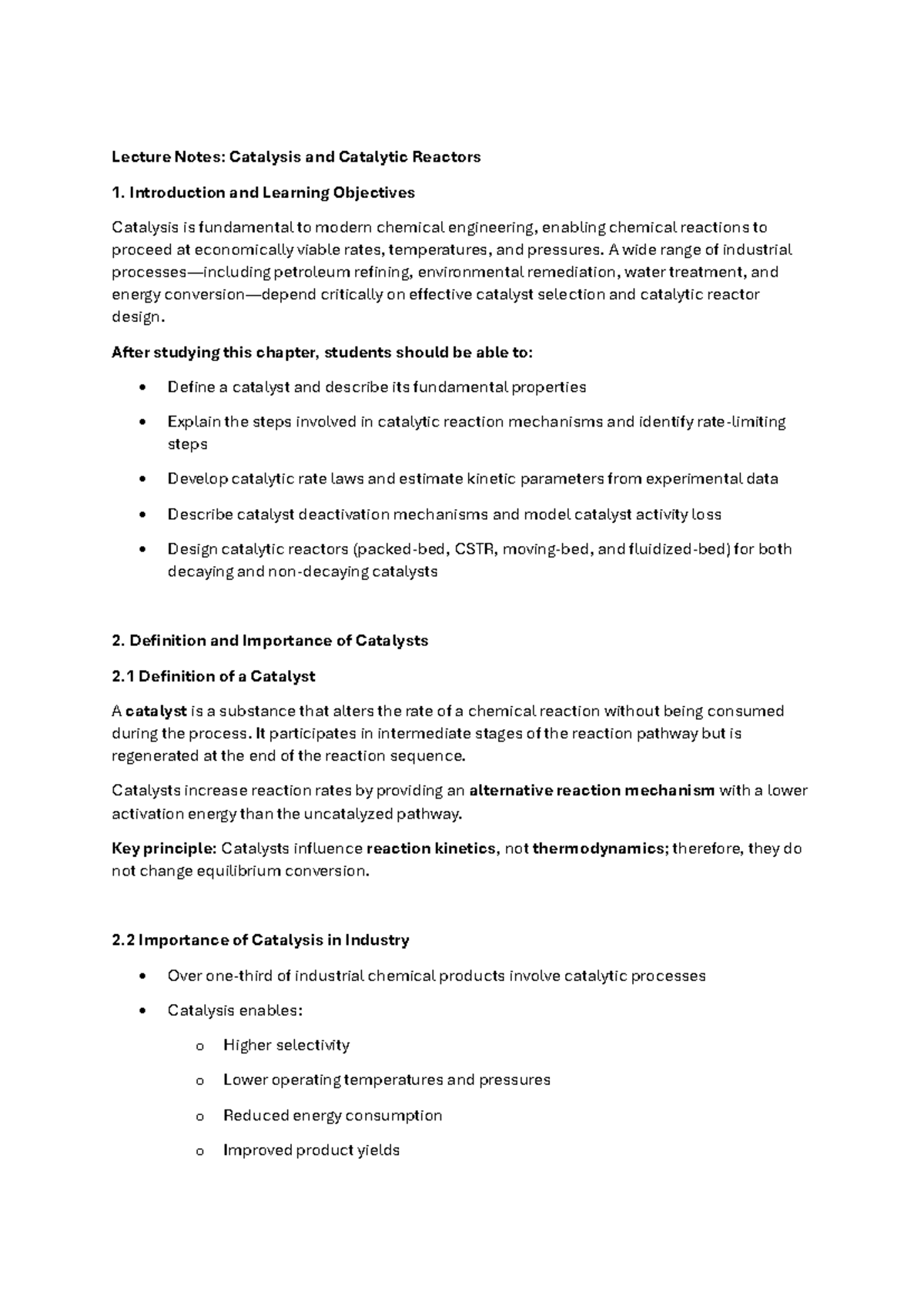 Lecture Notes: CHEM 301 - Catalysis and Reactor Design Overview - Studocu