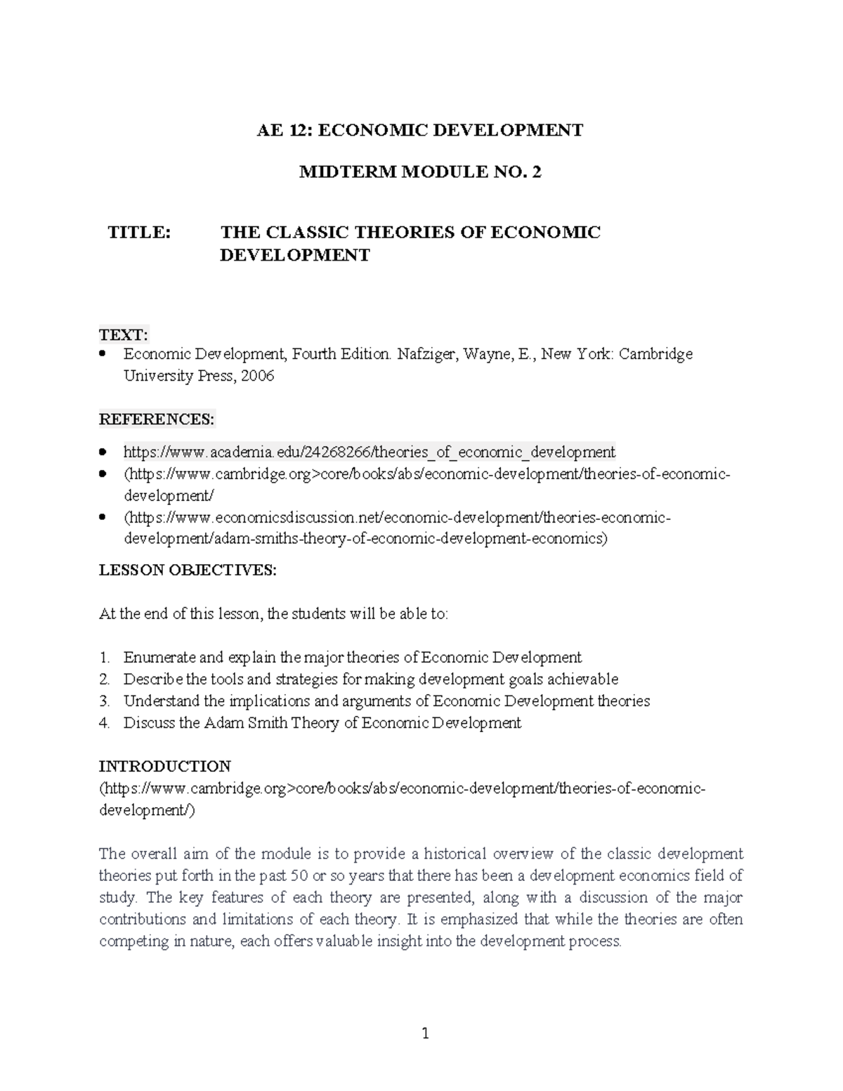 AE 12: Economic Development Midterm Module 2 - Classic Theories ...