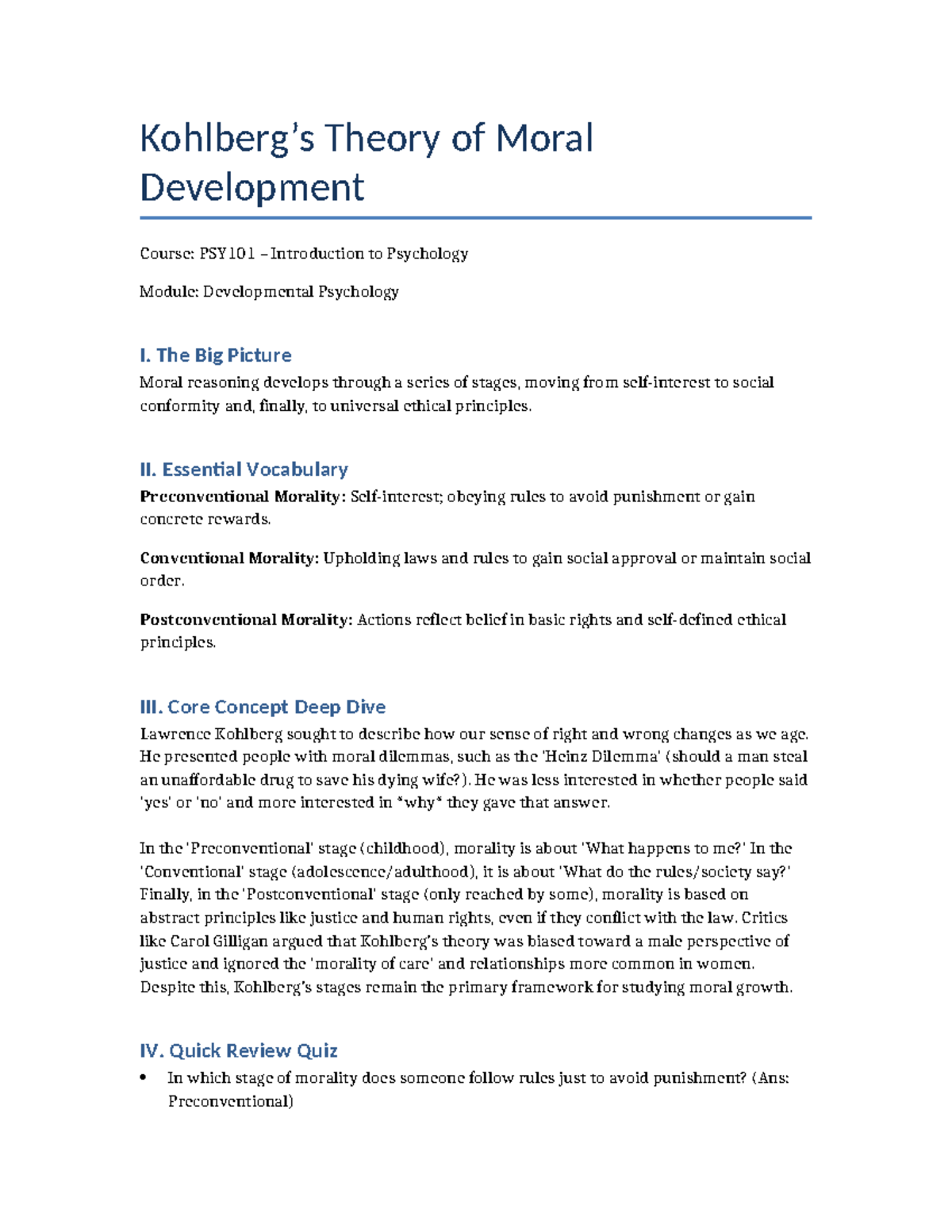 Kohlberg's Theory of Moral Development: PSY101 Overview - Studocu