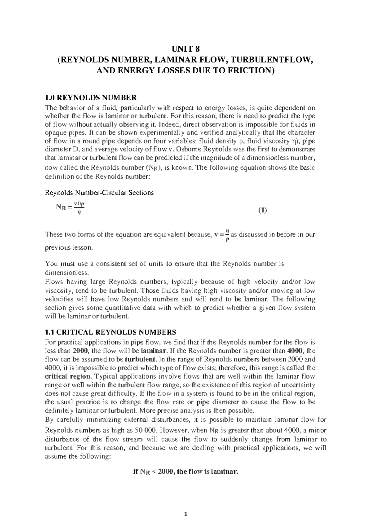 UNIT 8: Reynolds Number, Laminar & Turbulent Flow, Energy Losses - Studocu