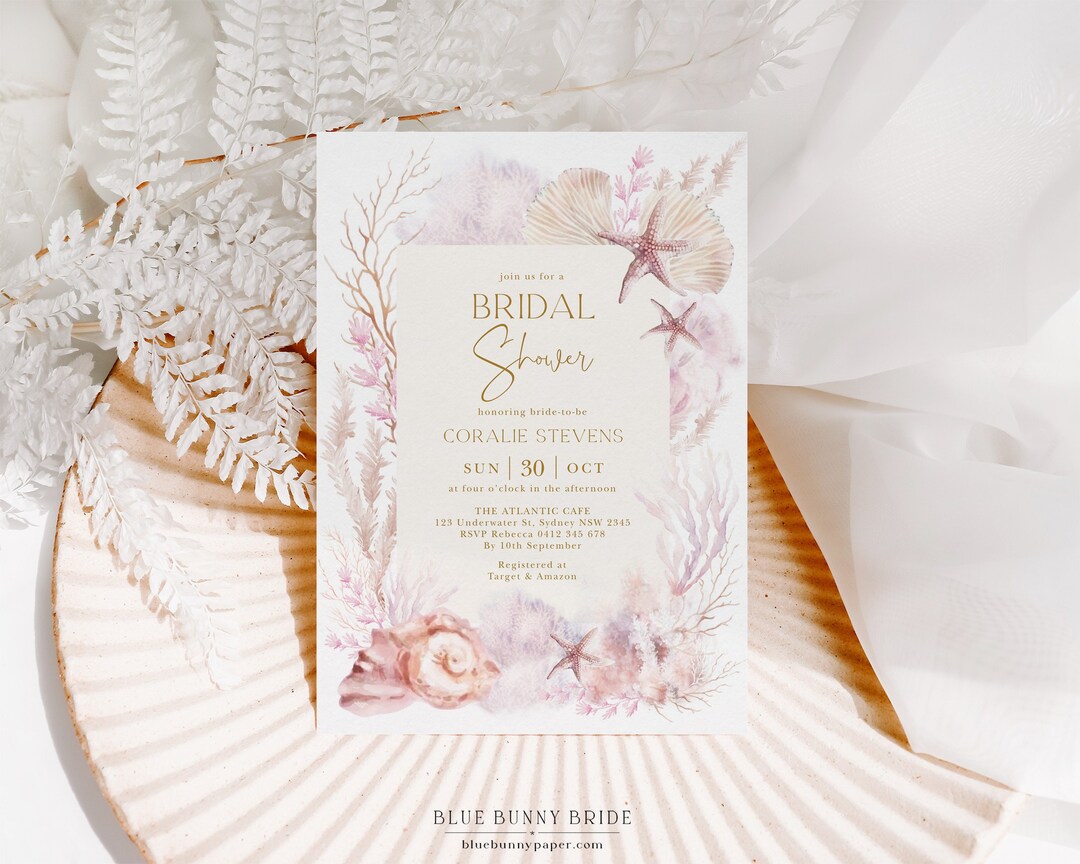 Ocean Bridal Shower Invitation Beach Wedding Shower Coral Sea Shells ...