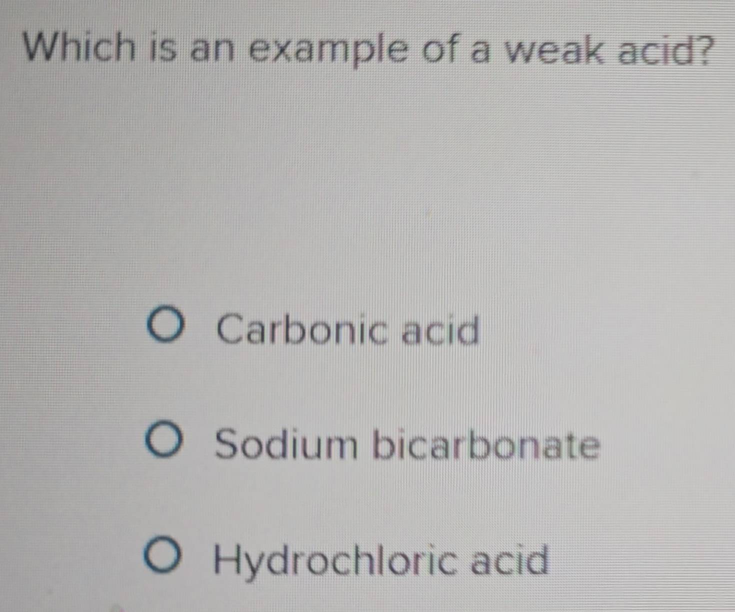 Solved: Which is an example of a weak acid? Carbonic acid Sodium ...