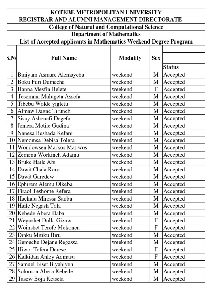 Accepted Applicants for Weekend Math Program | PDF