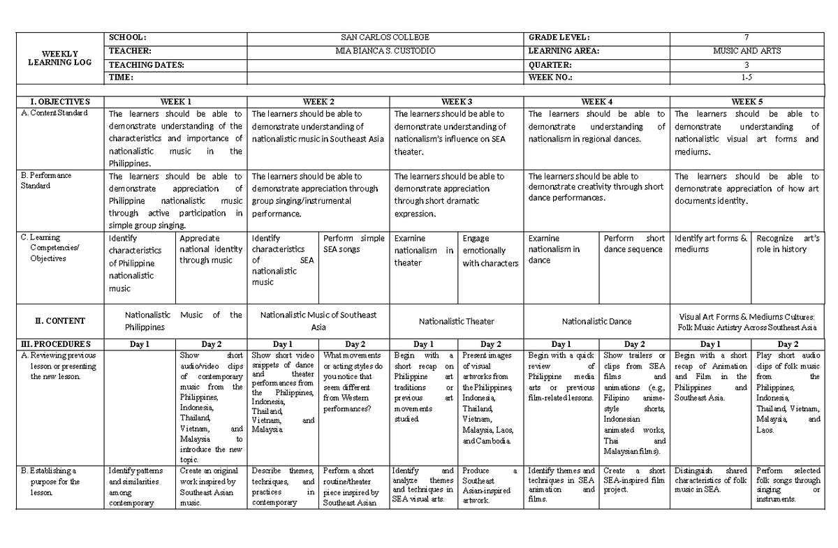 Q3-WLL: Weekly Learning Log for Music and Arts - Grade 7 - Studocu
