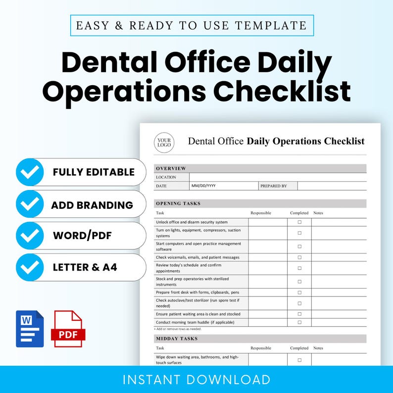Dental Office Daily Operations Checklist Template – Word & PDF, A4 + US ...