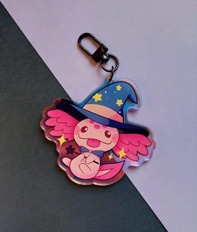 Axolotl Wizard Keychain - Rainbow Holographic Finish Acrylic Charm Cute ...