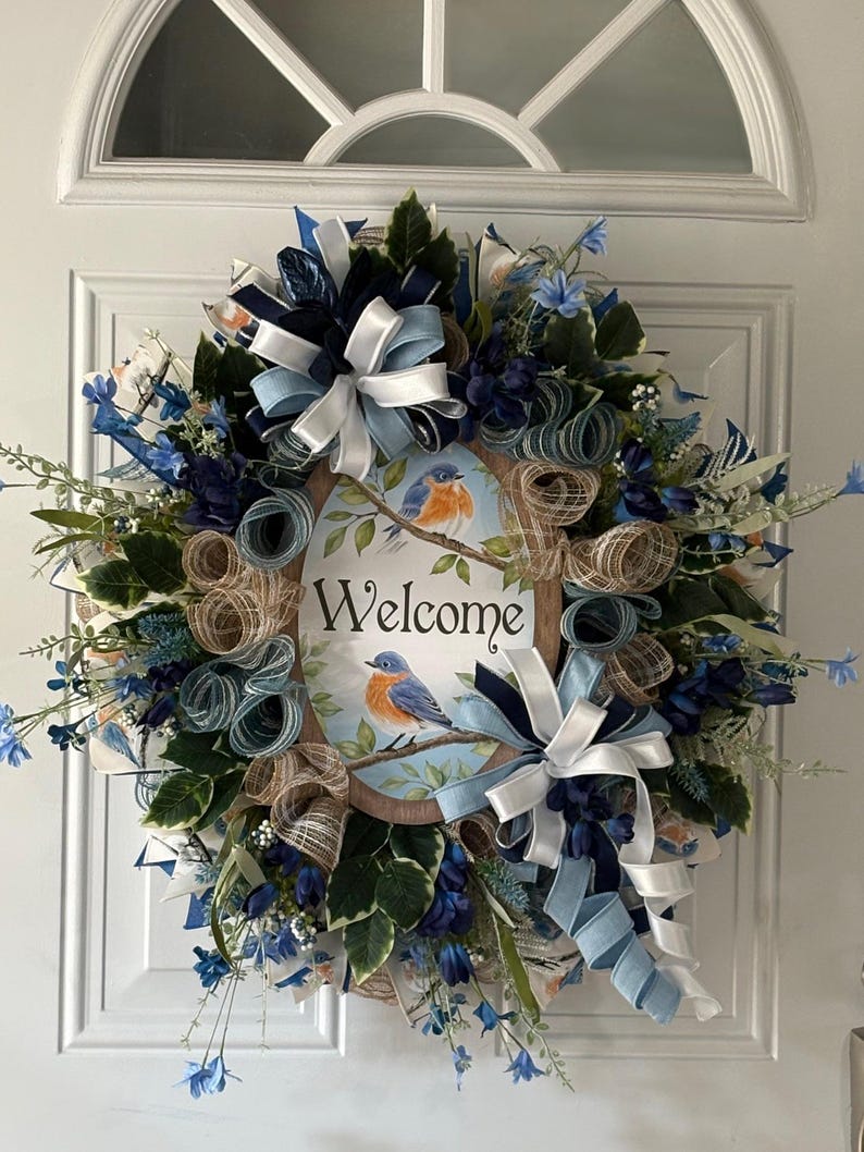 Bluebird Welcome Wreath, Spring Floral Door Decor, Farmhouse Garden ...