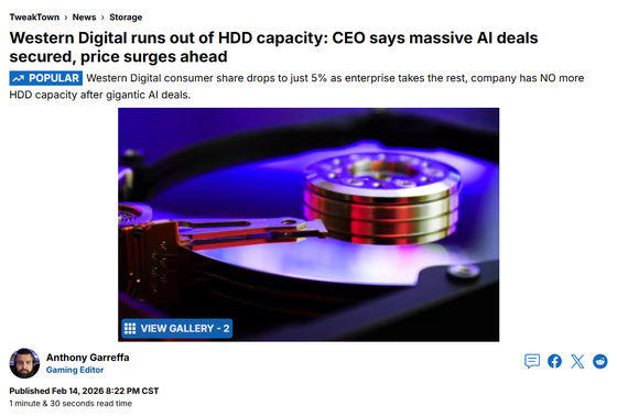 Western Digitalが「2026年供給分のHDDはほぼ完売」と明かす、爆発的なAI需要によりコンシューマー向け製品の売上は全体のわずか5%に