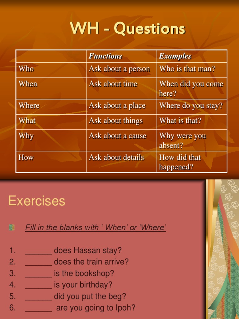 This is a grammar guide to Wh-questions. Some sentences are given as ...