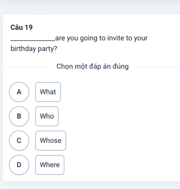 Giải quyết:are you going to invite to your birthday party? Chọn một đáp ...