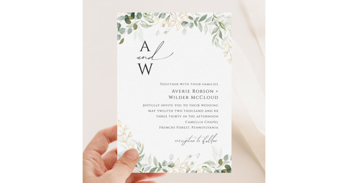 Whimsical Greenery and Gold Monogram Wedding Invitation | Zazzle