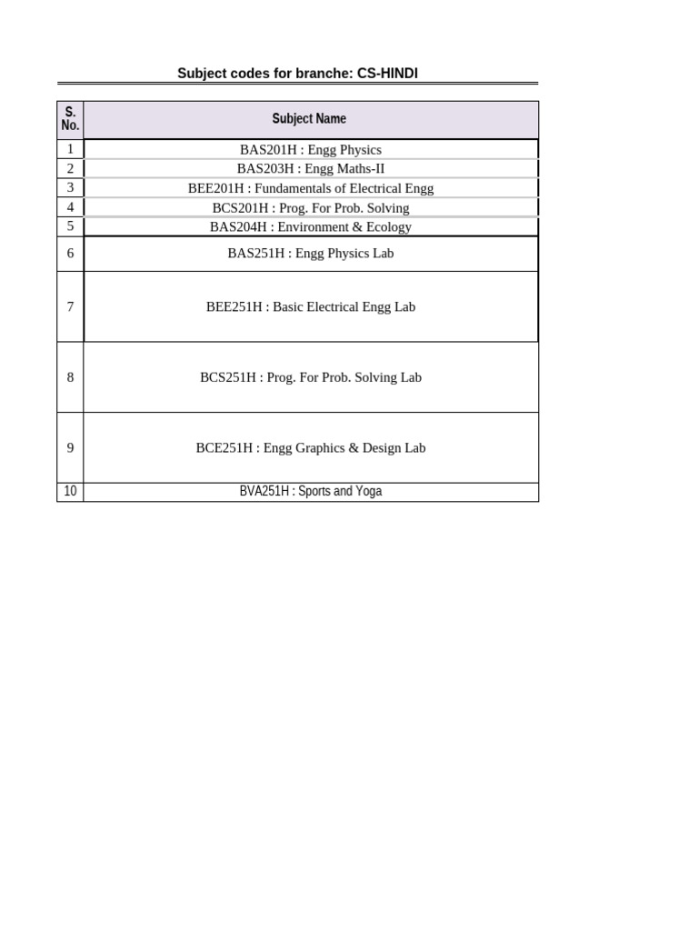 Subject & Subject Codes Only For CS-Hindi For Filling Even Sem Exam ...